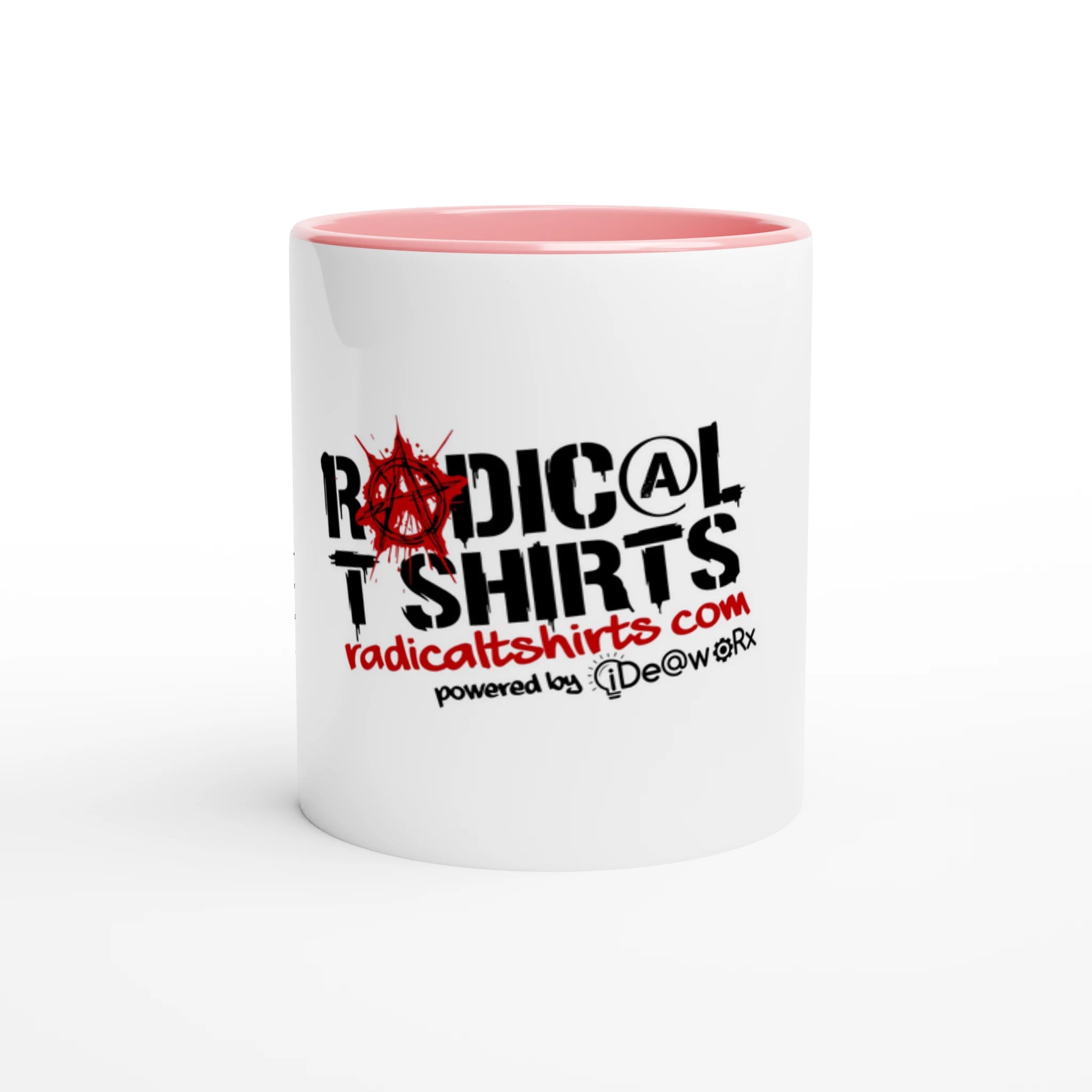 The Radical T Shirt Dot Com identity is printed beautifully and vividly on the brilliant white gloss. Our quality ceramic print retains its quality and luster when used in both microwaves and the dishwasher.