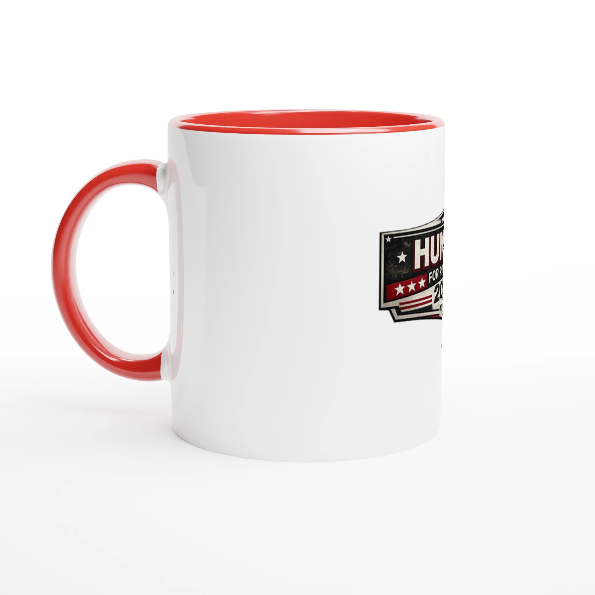 The glossy white exterior keeps the design crisp and readable, while the colored rim, handle, and inside add just enough personality to let people know you’re not running a normal campaign—or a normal morning.